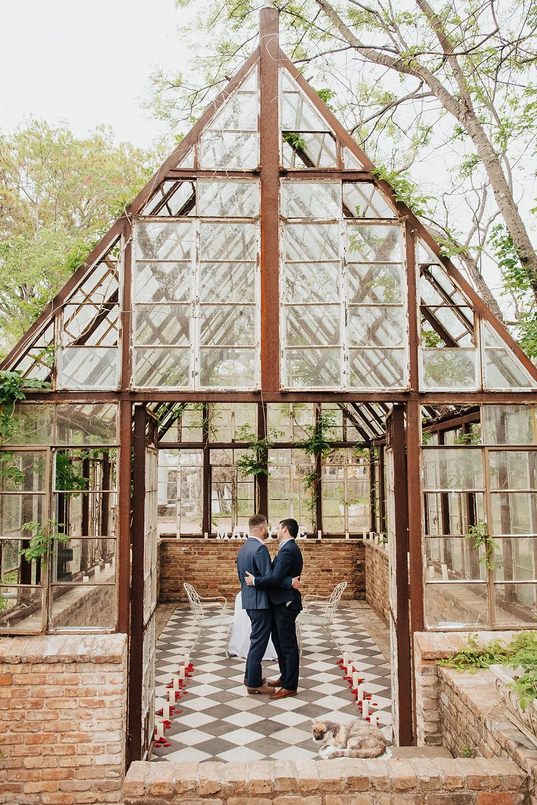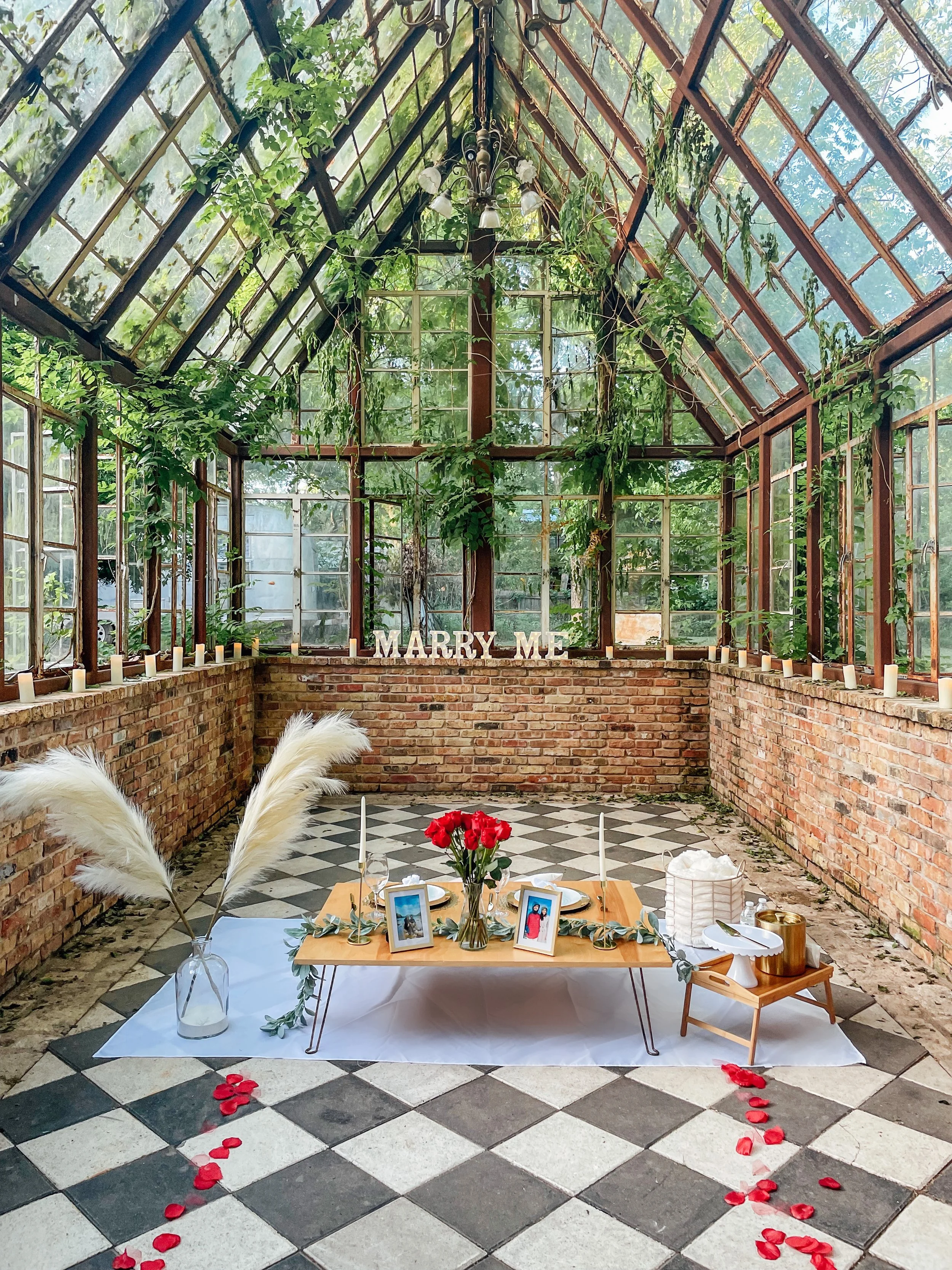 lush greenhouse rental, table + chair setup, bouquet of flowers, trail of rose petals, mini marry me marquee letters, champagne bottle + gold ice bucket stand, custom picture frames, violinist, professional photography
