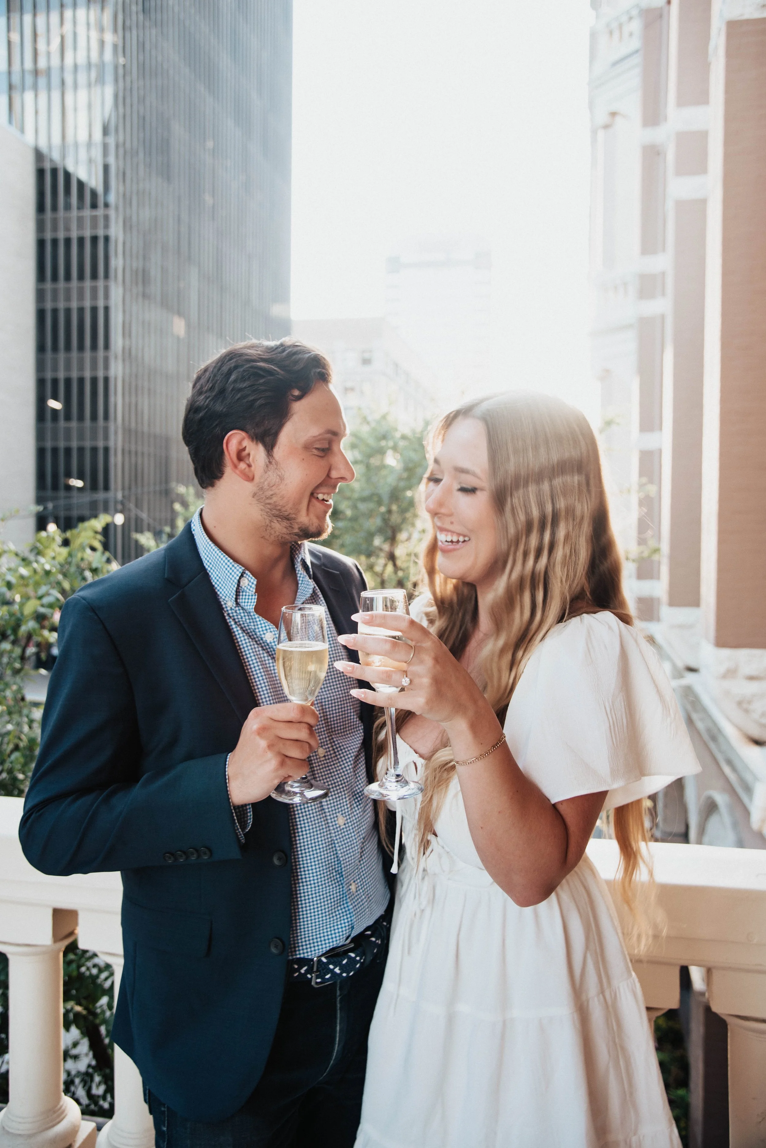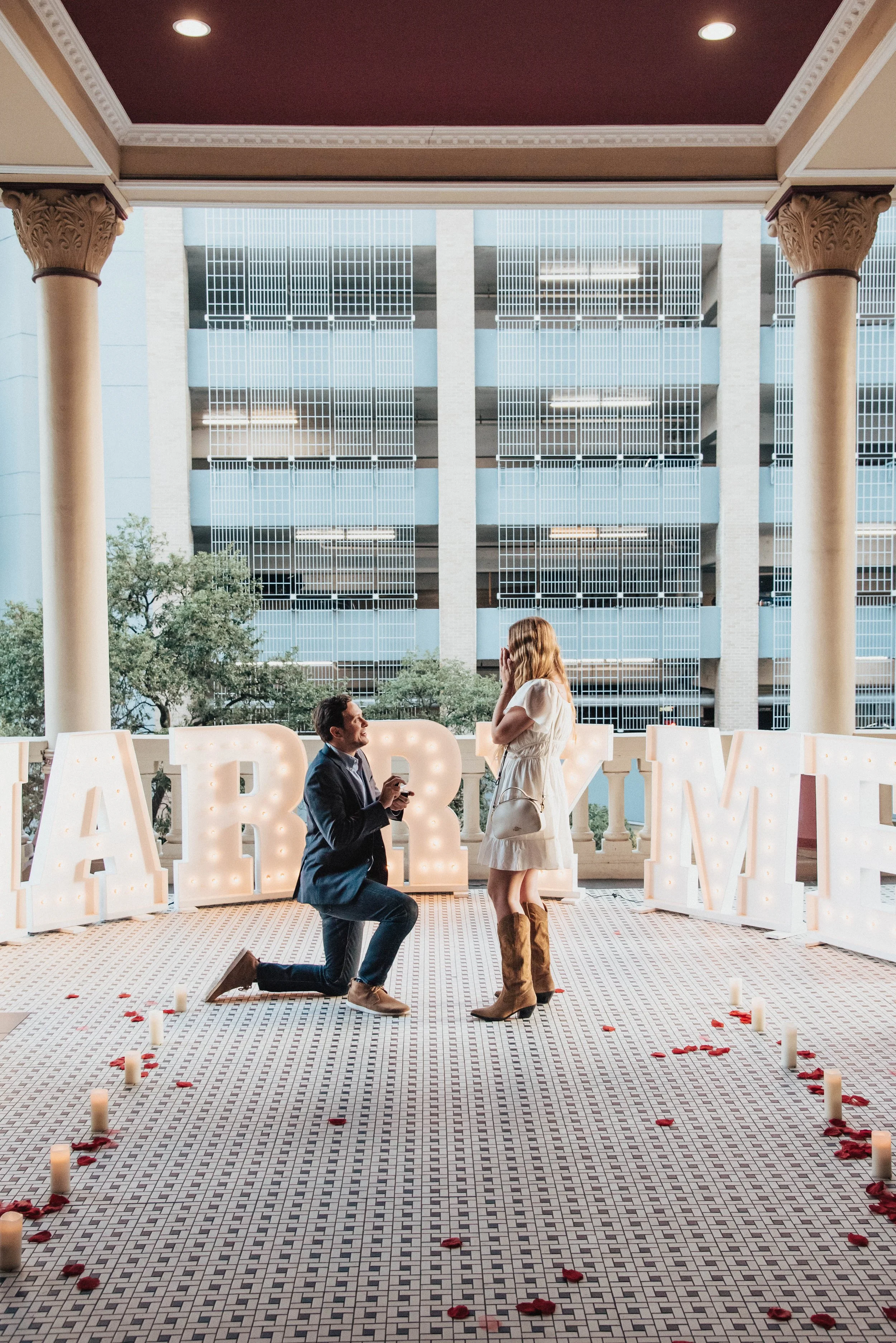 downtown venue rental, large marry me marquee letters, trail of rose petals, champagne & chilled glasses, custom picture frames, acoustic guitarist, 30 min professional photography