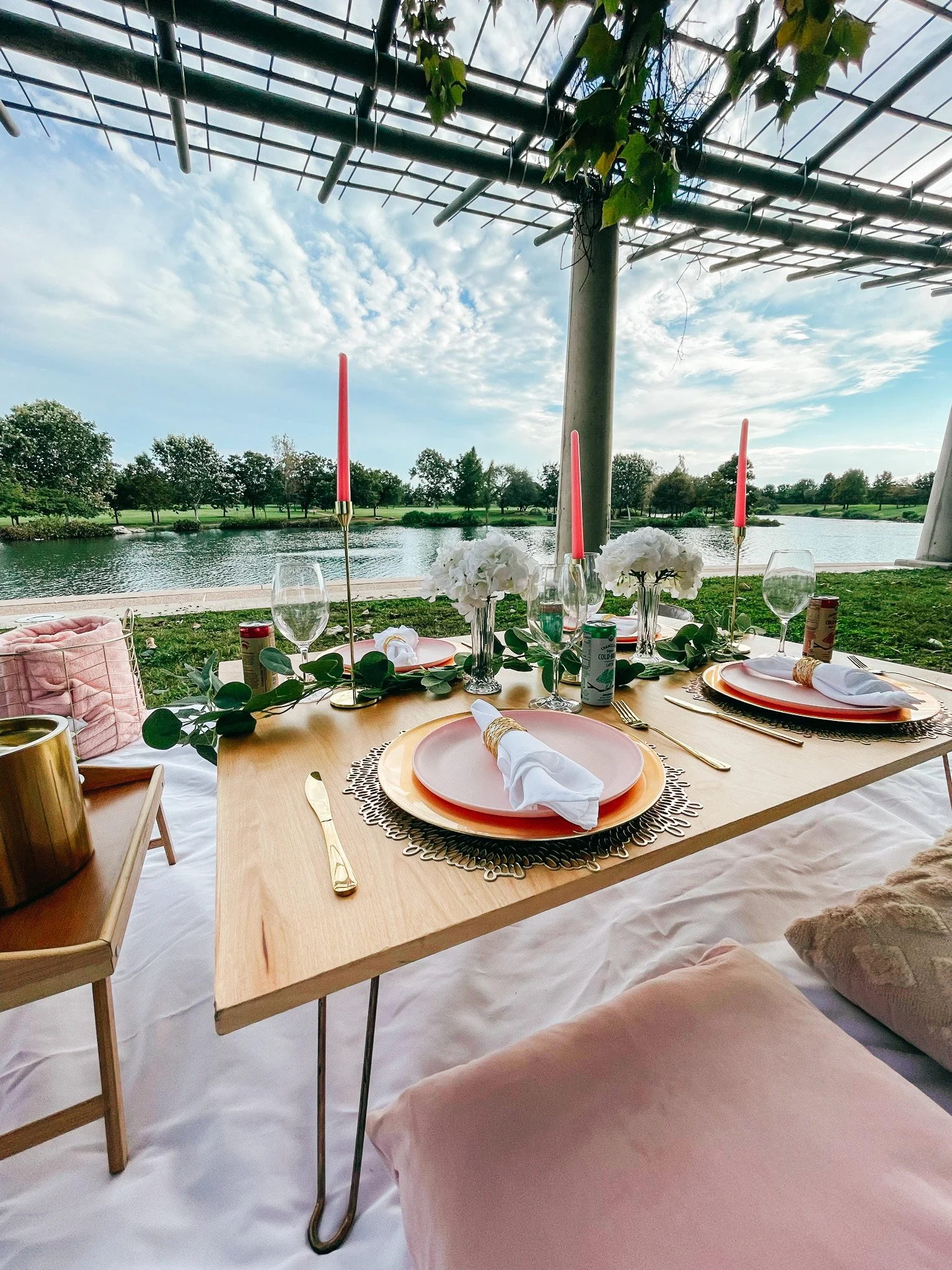 setup at a local park, custom-made picnic tables, pillows, blankets, custom table decor, photos, small marry me marquee letters, charcuterie board, acoustic guitarist, professional photography